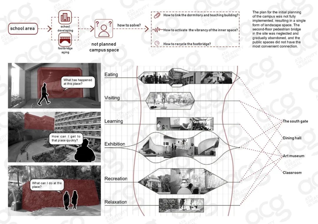 其中最好玩的地方就是贯穿整个校园的一个人行天桥,但是出于管理方面的问题一直没有被使用。所以我从这个点切入,通过重新设计天桥与周边的景观节点来激活整个校区的交通系统与场地活力。