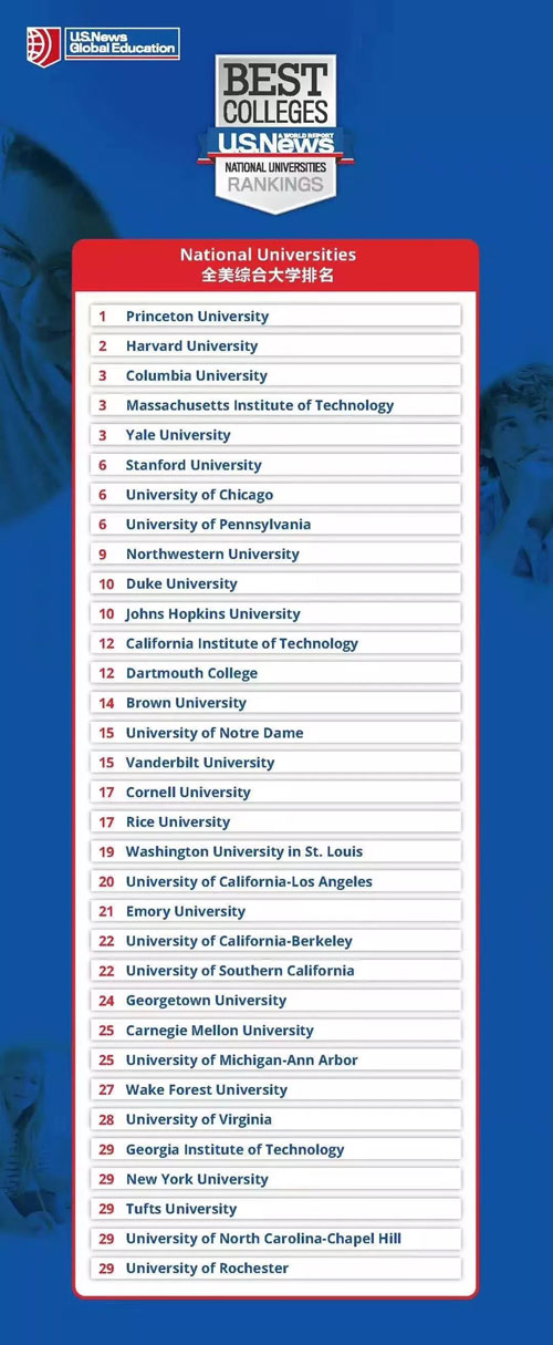 就今年USNews全美综合大学排名看,各个大学的竞争还是很激烈的。芝加哥大学跌出前三名,与斯坦福大学、宾夕法尼亚大学并列第六名;加州大学洛杉矶分校在UC内排名第一位列20;圣母大学和西北大学排名稍稍有所上升。好奇你的Dream School排名?下面附上USNews全美综合大学排名(TOP30)。