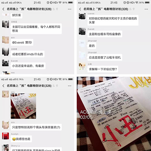 首次线上直播课《线上电影拉片公开课》人数爆满!由于课程名额有限!同学每天都靠“抢”的来占座位。同学们在群里激烈的交流着课程内容,还有同学认真的做了笔记!真的是很棒呢!
